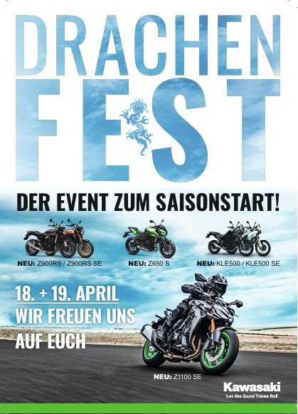Aus diesem Grund laden wir euch herzlich zum Drachenfest am 18. & 19. April 2026 ein. 🐉 Mit von der Partie sind natürlich unsere brandneuen Modelle wie die Z900RS / SE, Z650 S, KLE500 / SE sowie die Z1100 SE. 💯